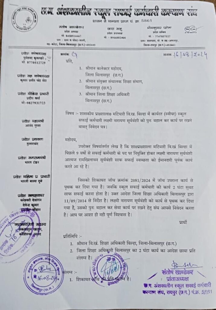 नेवसा:– गौरतलब है कि दिनांक 10 अगस्त को बिल्हा ब्लॉक के शिक्षा अधिकारियों के द्वारा जनपद प्राथमिक शाला मटियारी का निरीक्षण किया गया सफाई व्यवस्था को लेकर स्कूल सफाई कर्मचारी लक्ष्मीनारायण सूर्यवंशी को कार्य से बर्खास्त कर दिया गया था। दिनांक 16 अगस्त को स्कूल सफाई कर्मचारी संघ के प्रदेश अध्यक्ष संतोष खांडेकर के नेतृत्व में बिलासपुर कलेक्टर से मुलाकात करके सफाई कर्मचारी के बारे में अवगत कराया गया। कर्मचारी 14 वर्षों से स्कूलों में काम करके अपने परिवार का भरण पोषण करता है।
