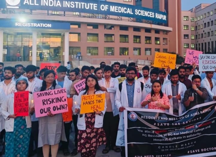 उसको रोकने के लिए और जघन्य कृत्य हत्या के आरोपियों को फांसी की सजा दिलाने के लिए आज सुबह 8:00 बजे से 2:30 तक एम्स हॉस्पिटल में धरना आंदोलन सभी डॉक्टरों द्वारा किया गया है इसका मैं शुक्रगुजार हूं और आज शाम 3:00 बजे से रैली निकाल कर रायपुर राजधानी के अंबेडकर चौक में सभी कॉलेज के मेकाहारा हो या जिला चिकित्सालय या एम्स के डॉक्टर हो सभी शासकीय डॉक्टर एकजुट होकर रैली निकालकर रात्रि 8:00 बजे तक अंबेडकर चौक पहुंचकर कैडर जलाकर श्रद्धांजलि अर्पित करते हुए हथियारों को जल्द से जल्द फांसी की सजा दो और मुख्य मांगे को डॉ आकांक्षा साहू ने पढ़कर सभी को सुनाया और सभी ने समर्थन किया