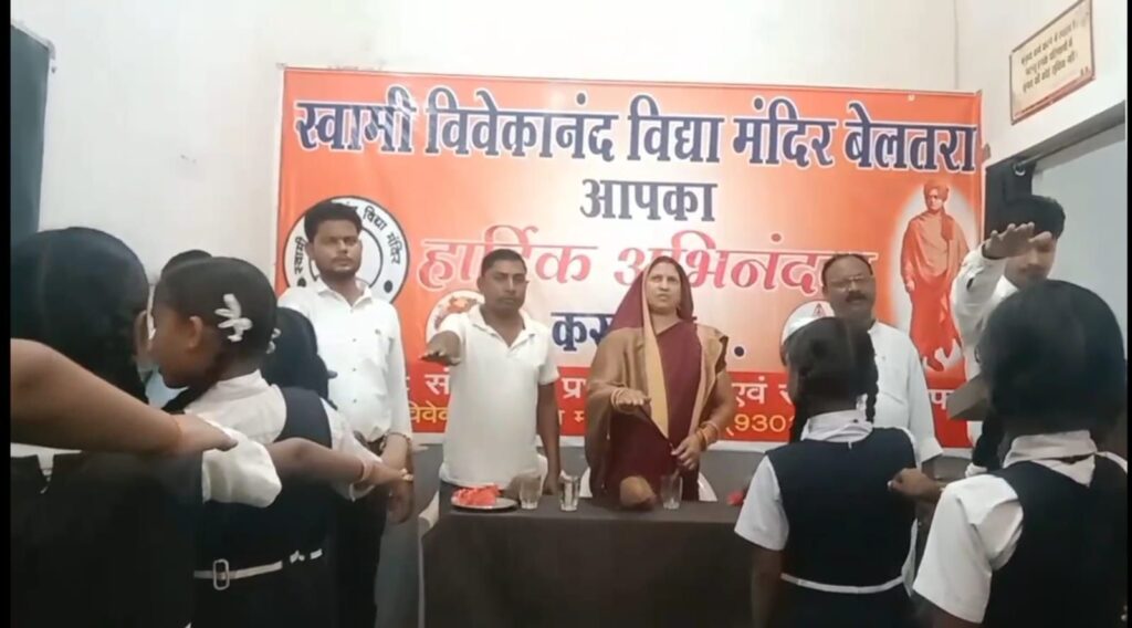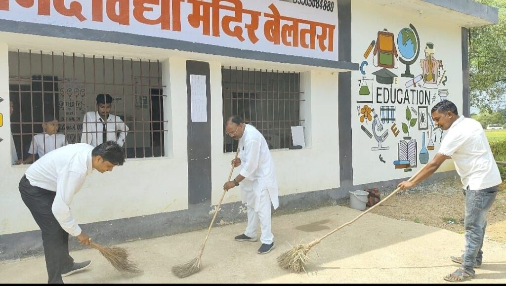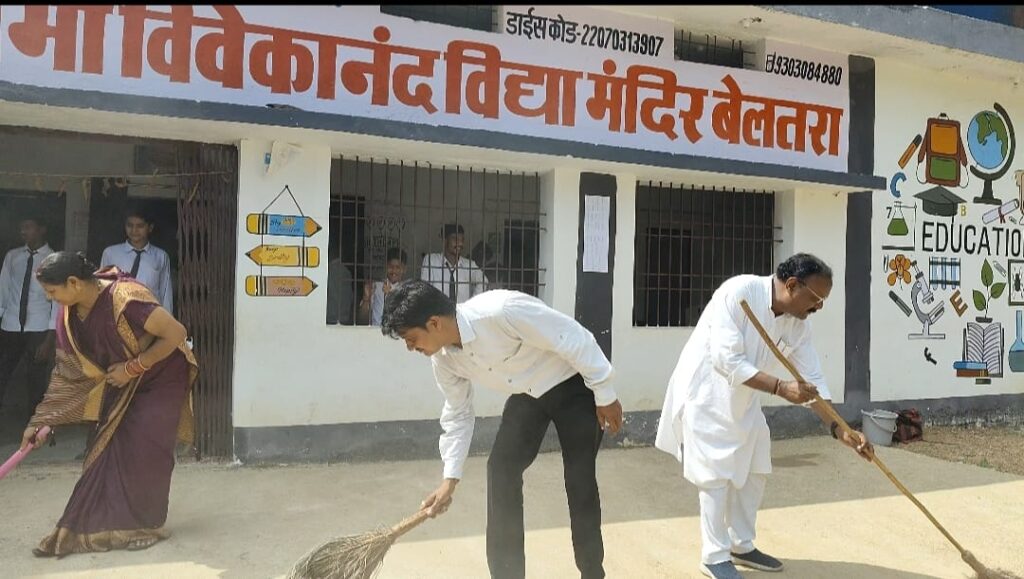 स्वच्छता ही सेवा पखवाड़ा समापन दिवस 1 अक्टूबर 2024 को स्वामी विवेकानंद विद्या मंदिर बेलतरा में जनप्रतिनिधियों के समक्ष विद्यालय के स्टाफ एवं विद्यार्थियों को शपथ ग्रहण कराया गया सर्वप्रथम गांधी जी की प्रतिमा पर तिलक लगाकर पुष्प अर्पित समस्त जनप्रतिनिधि एवं स्टाफ द्वारा किया गया । जनप्रतिनिधियों का समान तिलक लगाकर श्रीफल एवं पेन से किया गया ।