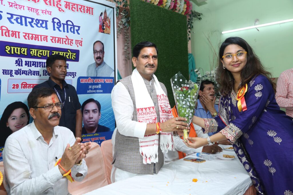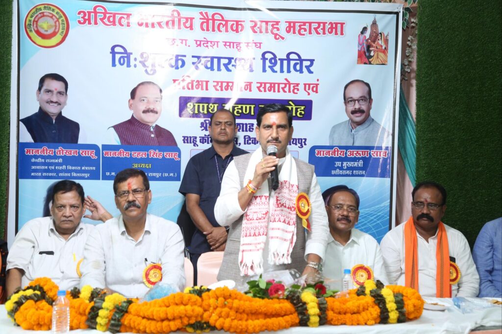 जिसमें मुख्य अतिथि भारत सरकार केंद्रीय राज्य मंत्री तोखन साहू ने कहा कि साहू समाज के इतिहास बहुत ही गौरवशाली है हमारे समाज में अनेकों महापुरुष जो भारत देश के लिए अनुक्रणीय कार्य किए हैं इसी क्रम में आज हमारे समाज के पढ़े-लिखे समाज सेवी डॉक्टरों द्वारा निशुल्क स्वास्थ्य शिविर में सैकड़ो लाभान्वित हुए और सबसे बड़ी बात है भावी पीढ़ी के डॉक्टर को जिनका इस वर्ष सिलेक्शन हुआ है उनका भी सम्मान किया जा रहा है यह बहुत ही अनुकरणीय कार्य है इससे इन लोगों को समाज के प्रति लगाव हो गया इस तरह के कार्यों को हमें बढ़ावा देना चाहिए और निश्चित ही तौर पर हमारे समाज आगे बढ़ रहा है और समाज में चहुमुखी विकास से ही समाज की उन्नति होगा कार्यक्रम के अध्यक्षता