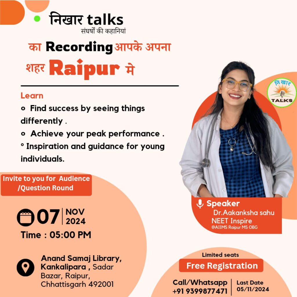 निःशुल्क कैरियर गाइडेंस निखार बातचीत कार्यक्रम 7 नवंबर रायपुर डॉ आकांक्षा साहू से रुबरु जानकारी देंगे