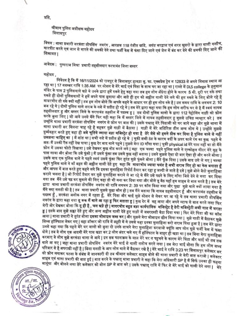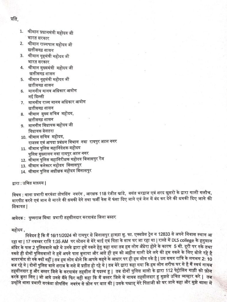 प्रभारी तहसीलदार करपावंड बस्तर पुष्पराज मिश्रा ने सरकंडा थाना प्रभारी तोप सिंह नवरंग, आरक्षक रंजीत खांडे, बसंत भारद्वाज और शरद खुसरो पर गाली गलौज करने,जान से मारने और झूठे मामले में फंसा दिए जाने की धमकी देने की शिकायत एसपी और कलेक्टर से लेकर प्रधानमंत्री गृहमंत्री मानव अधिकार आयोग और विधायक तक से की है।