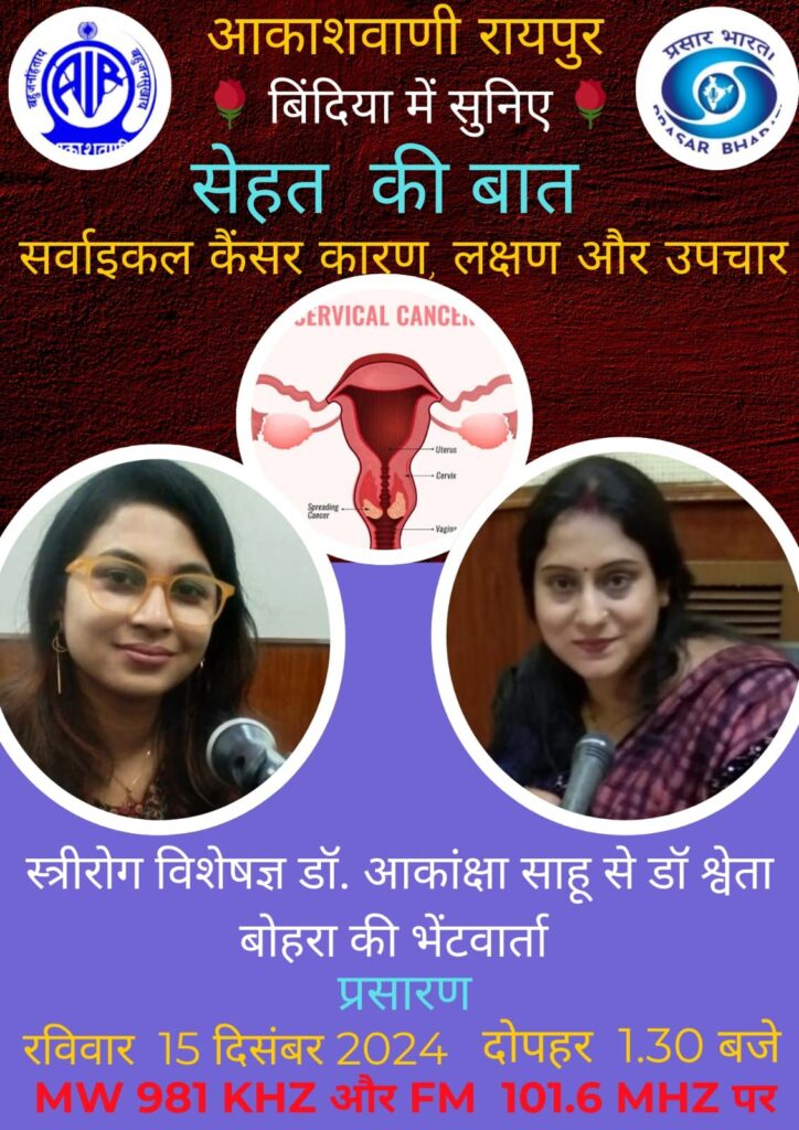 छत्तीसगढ़ राजधानी रायपुर के आकाशवाणी से सुप्रसिद्ध हॉस्पिटल एम्स के स्त्री रोग विशेषज्ञ सर्जन जे आर डॉ आकांक्षा साहू राष्ट्रीय कार्यवाहक अध्यक्ष अखिल भारतीय तैलिक साहू महासभा एवं शिक्षा एवं स्वास्थ्य के जनजागृति फाउंडेशन संस्थापक अध्यक्ष के द्वारा प्रसारण “सेहत की बात ” बिंदिया में सुनिए सर्वाइकल कैंसर के कारण लक्षण और उपचार के प्रसारण दिनांक 15 दिसंबर 2024 दिन रविवार समय दोपहर 1: 30 बजे एम डब्लू 981 KHZ एवं एफ एम FM 101.6 MHZ पर होगा जिसमें विस्तार रूप से स्वास्थ्य के बारे में जानकारी देंगे