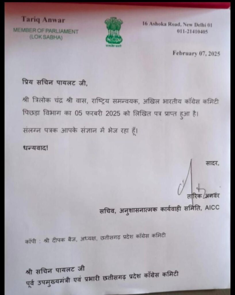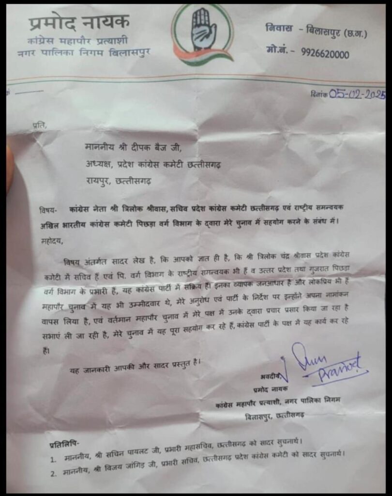 मैं कांग्रेस का राष्ट्रीय पदाधिकारी जिला अध्यक्ष को कार्यवाही का अधिकार नहीं- त्रिलोक चंद्र श्रीवास, नेवसा:– जिला कांग्रेस कमेटी बिलासपुर के अध्यक्ष विजय केसरवानी के द्वारा कांग्रेस नेता त्रिलोक श्रीवास को निष्कासन किए जाने पर कांग्रेस नेता त्रिलोक श्रीवास ने अपनी प्रतिक्रिया प्रेस के माध्यम से व्यक्त किया है, उन्होंने कहा कि वह कांग्रेस पार्टी के राष्ट्रीय पदाधिकारी हैं, वह अखिल भारतीय कांग्रेस कमेटी पिछड़ा वर्ग विभाग के राष्ट्रीय समन्वयक है, एवं उत्तर प्रदेश तथा गुजरात के प्रभारी हैं, उन्होंने पार्टी विरोधी कोई कार्य नहीं किया है ,नगर निगम चुनाव में उन्होंने महापौर प्रमोद नायक के पक्ष में पूरा कार्य किया था, जिस पर महापौर प्रत्याशी प्रमोद नायक जी ने उनके समर्थन में पत्र भी जारी किया है