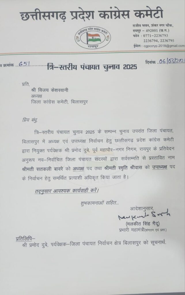 बिलासपुर जिला पंचायत अध्यक्ष हेतु सत्यकली बावरे , उपाध्यक्ष हेतु स्मृति त्रिलोक श्रीवास कांग्रेस के अधिकृत उम्मीदवार घोषित।