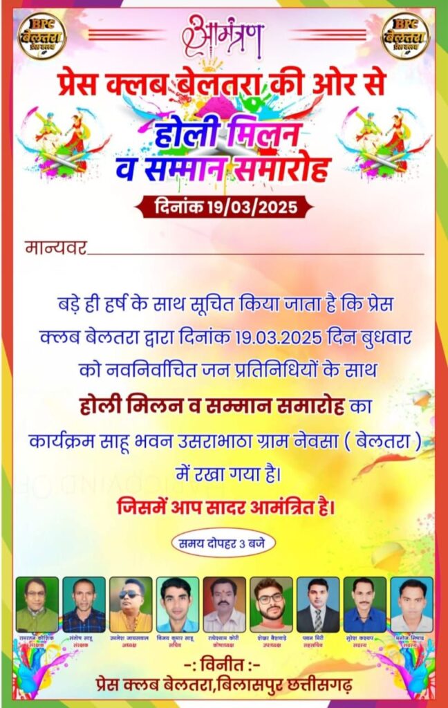 बेलतरा- 19 मार्च को शाम 3:00 बजे से होली मिलन एवं नव निर्वाचित जनप्रतिनिधियों का सम्मान समारोह कार्यक्रम साहू भवन नेवसा उसराभाठा में संपन्न होगा।