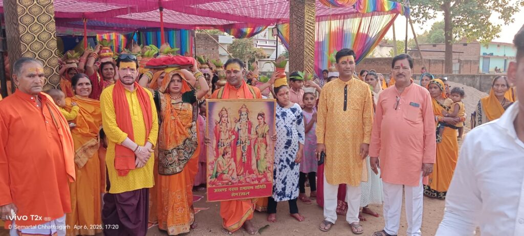 भरारी :- ग्राम सेमरताल में रामनवमी के शुभ दिवस पर अखंड नवधा रामायण की शुरुआत कलश यात्रा के साथ हो गया है। कलश यात्रा की शुरुआत पुरोहित रामफल द्विवेदी के मंत्रोच्चार, शंख ध्वनि और राम जयकारे के साथ हुआ। कलशयात्रा की अगुवाई रविन्द्र मिथलेश गहवई ने किया जो कि मुख्य यजमान हैं।