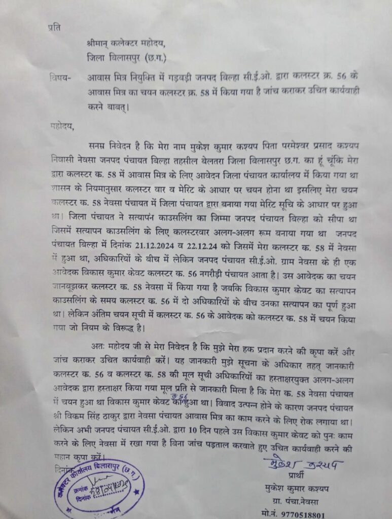 जिला पंचायत बिलासपुर द्वारा जारी काउंसलिंग के समय जारी किया गया पत्र में स्पष्ट किया गया है की आवेदक द्वारा किसी भी प्रकार की गलत जानकारी दिया जाना गलत दस्तावेज दिया जाना या अपूर्ण जानकारी हो पाया जाएगा तो आवास मित्र समर्पित मानव संसाधन की सेवाएं नहीं ली जाएगी लेकिन बिल्हा सीईओ ने लापरवाही पूर्वक कलस्टर क्रमांक 56 के आवेदक को क्लस्टर क्रमांक 58 में भर्ती ले लिया है । जिला पंचायत बिलासपुर में चयन होने के पश्चात सत्यापन का जिम्मा जनपद पंचायत बिल्हा को सौंपा था इसलिए क्लस्टर वार नंबर के अनुसार सत्यापन के लिए अलग-अलग रूम बनाया गया था । लेकिन जब काउंसलिंग सत्यापन में जिसका क्लस्टर 58 में सत्यापन काउंसलिंग नहीं हुआ है उसका चयन फिर कैसे 58 में हो गया ।आवेदक मुकेश कुमार ने जनपद सीईओ की मनमानी पूर्वक भर्ती करने का मामला को देखते जिला कलेक्टर पहुचकर जनदर्शन में शिकायत किया तब कलेक्टर ने बहुत जल्द समस्या का निराकरण करने की बात कही ।