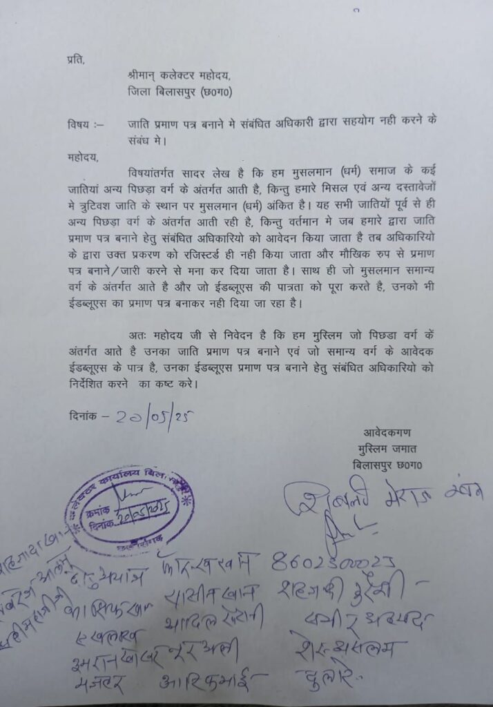 लगातार बिलासपुर ज़िले के विभिन्न तहसीलों से ये शिकायतें आ रही है की EWS (Economically Weaker Section) के पात्र लोगों का प्रमाण पत्र विभिन्न तहसीलों में नहीं बनाया जाना साथ ही नियमों का हवाला देकर पिछड़ा वर्ग का प्रमाण पत्र भी मुस्लिम समाज का नहीं बनाया जा रहा है इससे व्यथित हो बिलासपुर मुस्लिम समाज का एक प्रतिनिधि मंडल जिलाधीश से मिलकर ज्ञापन सौंप वस्तु स्थिति से अवगत करा इसे त्वरित सुधारने बात रखी गयी। मा.जिलाधीश महोदय ने मुस्लिम समाज के प्रतिनिधिमंडल को आश्वस्त किया की इस ओर जल्द ही नियमतः कार्यवाही हेतु निर्देशित किया जाएगा।