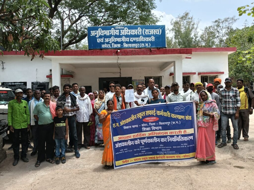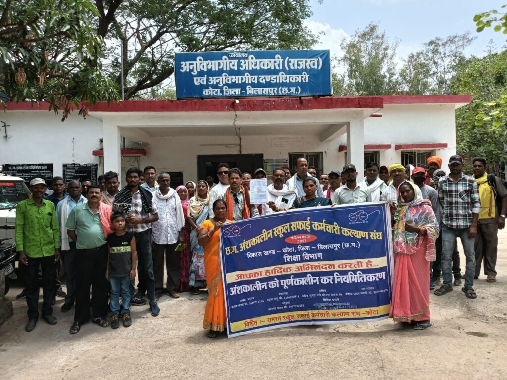 नेवसा:– छत्तीसगढ़ की सरकारी स्कूलों में अंशकालिक के रूप में साफ सफाई करने वाले कर्मचारियों ने संघ की मांग और युक्ति युक्तकरण को लेकर 2 जून को छत्तीसगढ़ की सभी ब्लॉक मुख्यालय में धरना दिया ।अनुभागीय अधिकारी को मुख्यमंत्री, सचिव स्कूल शिक्षा विभाग, संचालक लोक शिक्षण संचालनालय के नाम पर ज्ञापन सौपा गया है।