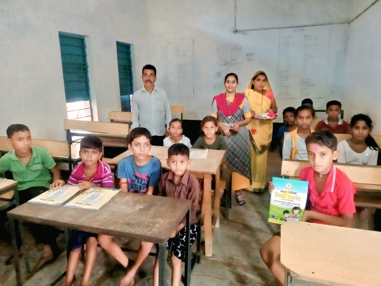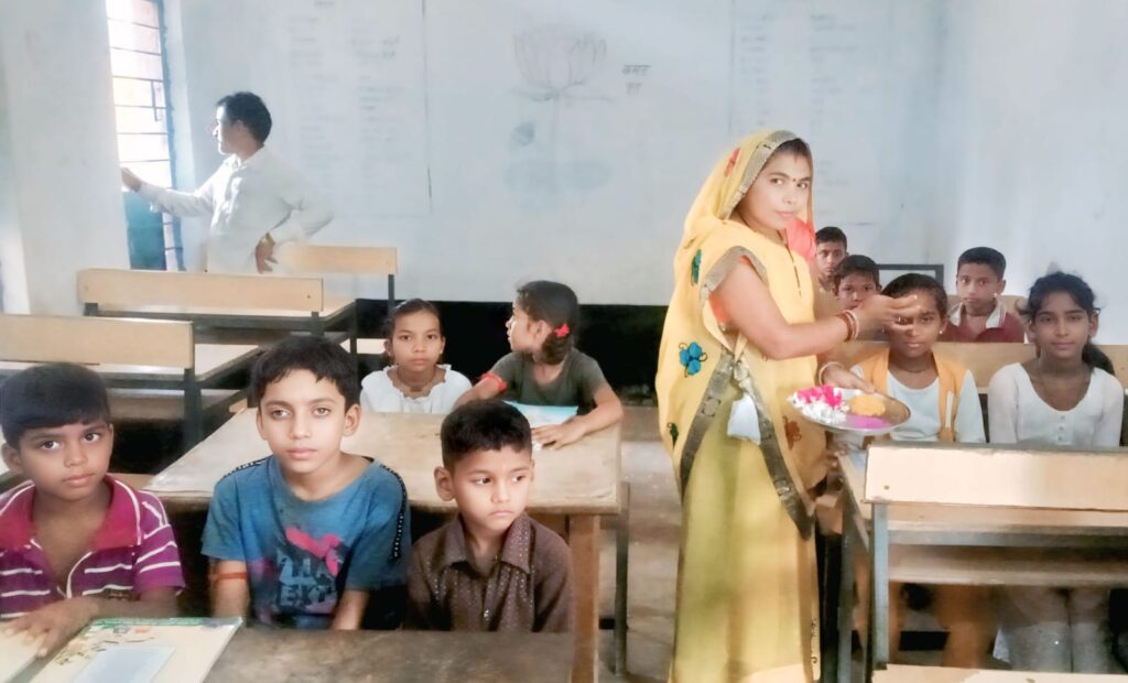 जनपद पंचायत सदस्य कमला विजय साहु ने तिलक लगाकर, मिठाई खिलाकर नवप्रवेशी छात्रों का स्वागत किया।