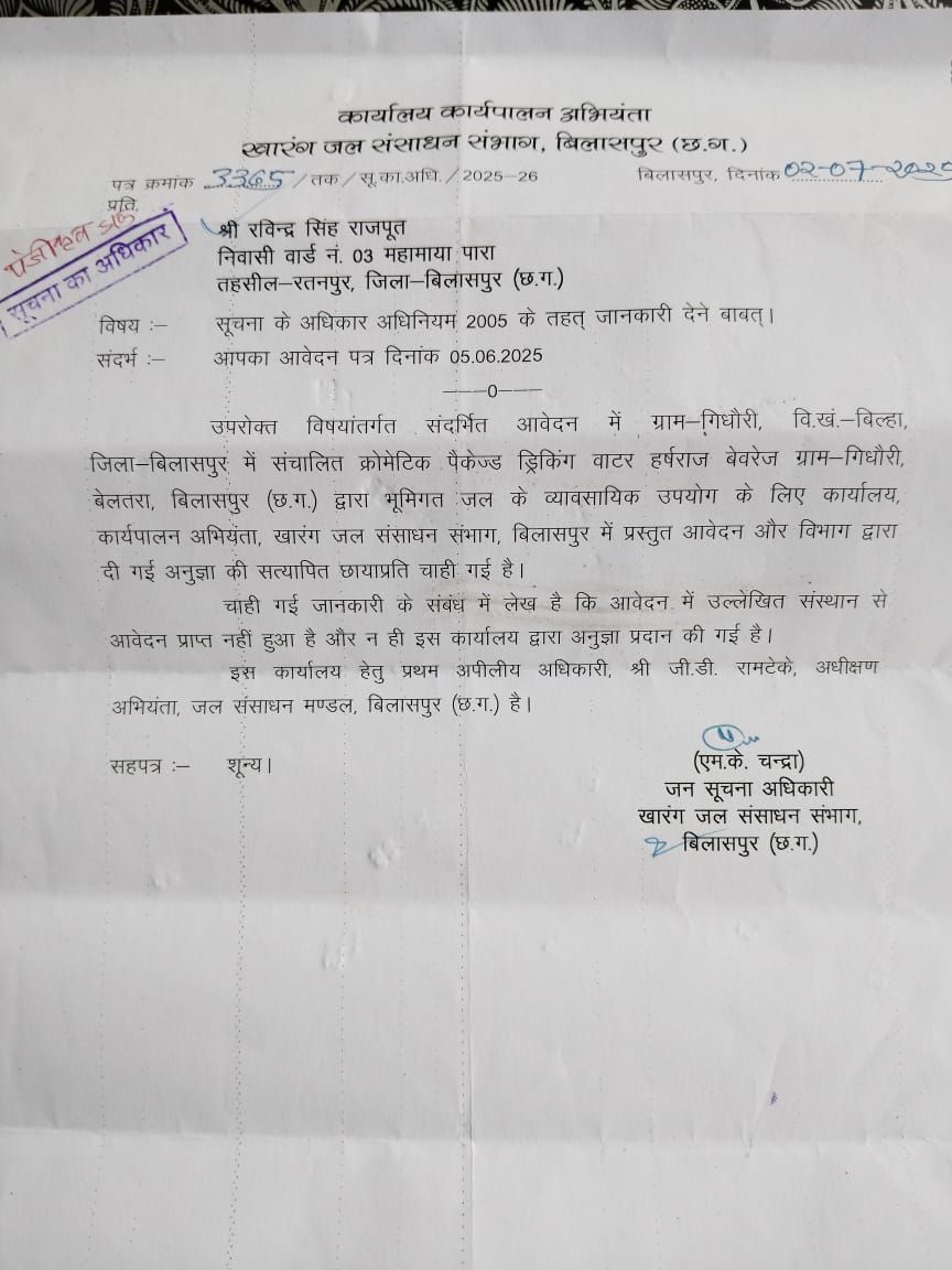 रतनपुर निवासी द्वारा 5 जून 2025 को दायर आवेदन के जवाब में जल संसाधन विभाग, बिलासपुर ने पत्र क्रमांक 3365, दिनांक 02.07.2025 को जानकारी दी कि विभाग के पास ऐसी कोई अनुमति जारी करने का रिकॉर्ड नहीं है और न ही कंपनी द्वारा कोई आवेदन प्रस्तुत किया गया है।