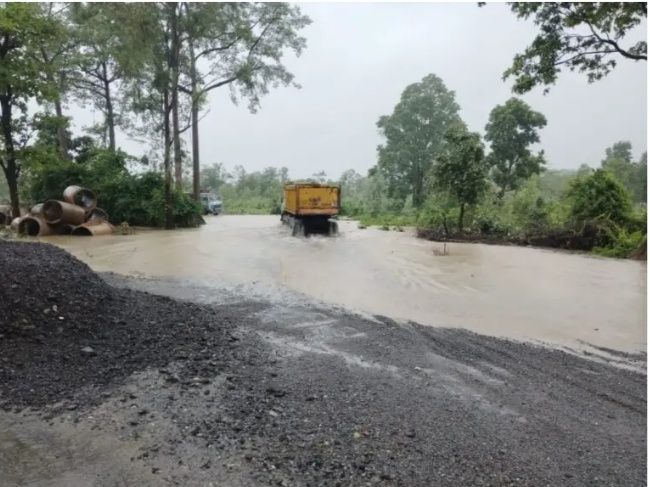 रतनपुर मंजवानी केंदा मार्ग पर सेमरा मोड़ के पास निर्माणधीन सड़क के कारण बनाए गए वैकल्पिक मार्ग में तीन से चार फीट तक का पानी भरा है l
