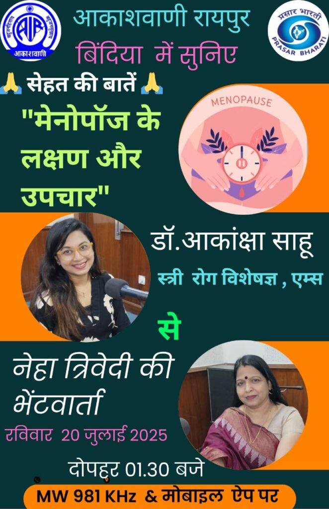 *छत्तीसगढ़ राजधानी रायपुर के आकाशवाणी से सुप्रसिद्ध हॉस्पिटल एम्स के स्त्री रोग विशेषज्ञ सर्जन जे आर डॉ आकांक्षा साहू राष्ट्रीय कार्यवाहक अध्यक्ष अखिल भारतीय तैलिक साहू महासभा एवं शिक्षा एवं चिकित्सा प्रकोष्ठ छत्तीसगढ़ प्रदेश साहू संघ के प्रदेश अध्यक्ष के द्वारा प्रसारण “सेहत की बात* ” बिंदिया में सुनिए *मेनोपॉज के लक्षण और उपचार * के संबंध में *प्रसारण दिनांक 20 जुलाई 2025 दिन रविवार समय दोपहर 1: 30 बजे एम डब्लू 981 KHZ एवं एफ एम FM 101.6 MHZ एवं मोबाइल ऐप प्रसारण* होगा जिसमें विस्तार रूप से स्वास्थ्य के बारे में जानकारी देंगे