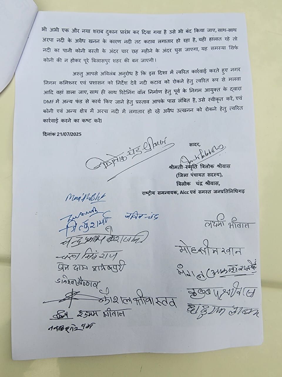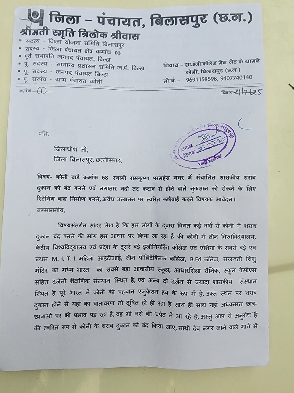 कांग्रेस नेता त्रिलोक श्रीवास ने कोनी में शराब दुकान बंद करने, नदीतट कटाव, अवैध उत्खनन रोकने संबंधी मांगों पर जिलाधीश को सौंपा ज्ञापन, मांगे पुरी नहीं होने पर होगा आंदोलन।
