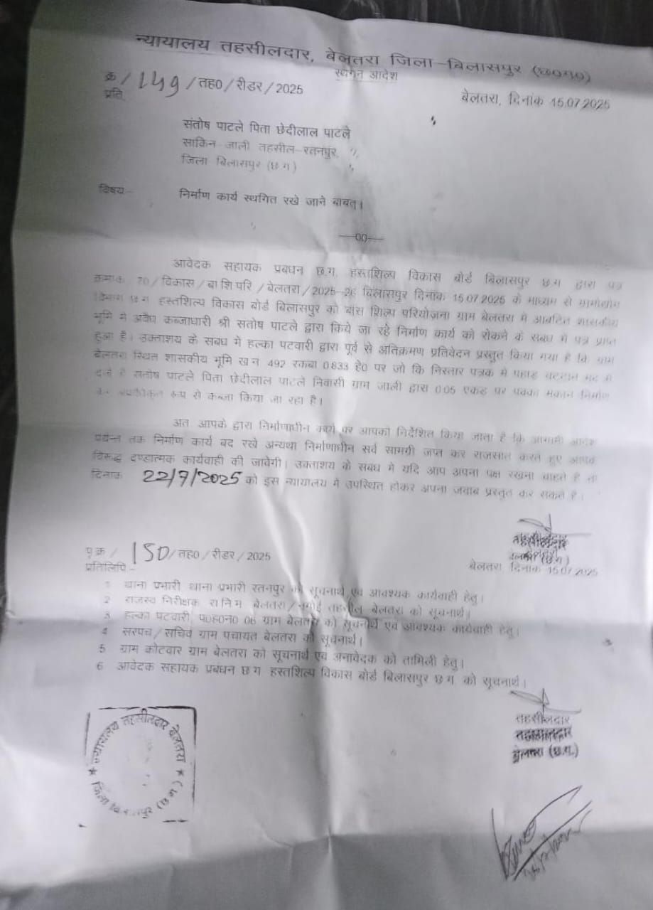 *अवैध बेजा कब्जाधारी पर न्यायालयीन स्थगन नोटिस की असर, बे-असर**बेलतरा-* न्यायालय तहसीलदार बेलतरा द्वारा पत्र क्रमांक 144 संतोष पाटले पिता छेदीलाल पाटले निवास जाली जो की बेलतरा आवेदक सहायक प्रबंधन छ.ग.शिल्प विभाग बोर्ड बिलासपुर द्वारा पत्र क्रमांक 70 बा. शि. परि. बेलतरा द्वारा तहसील कार्यालय को शिकायत दर्ज कराया कि उक्त शासकीय भूमि पर खसरा नंबर 492 रकबा 0833 हेक्टेयर पर है जो की विस्तार पत्र के पहाड़ चट्टान मद से है। जिसे संतोष पाटले पिता छेदीलाल पाटले निवास ग्राम जाली द्वारा 005 एकड़ पर अवैध रूप से पक्का मकान अनधिकृत रूप से निर्माण किया जा रहा है। जिसके रोक के लिए तहसील कार्यालय से स्थगन नोटिस जारी के बावजूद बेजा कब्जा निर्माण किया जा रहा है।