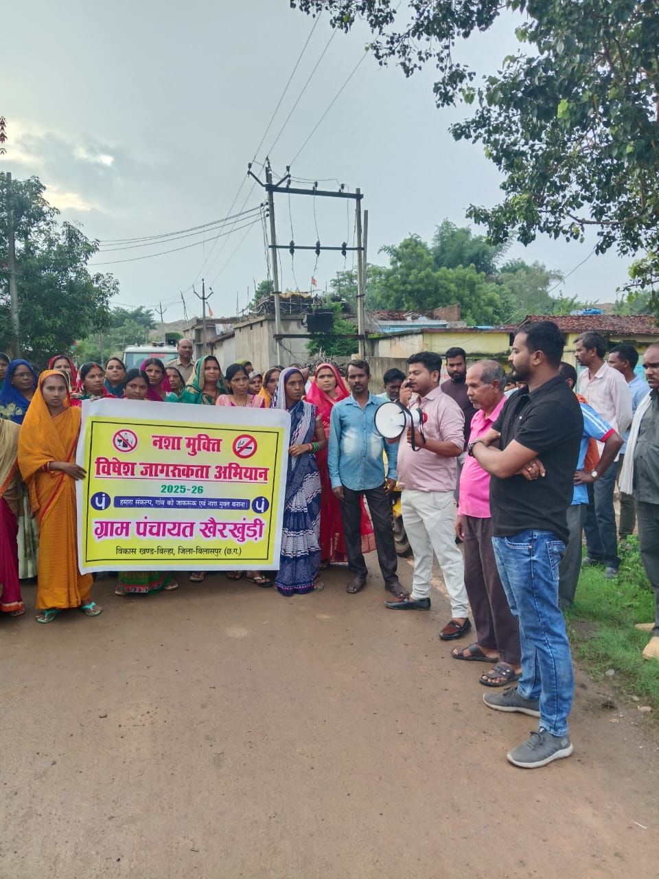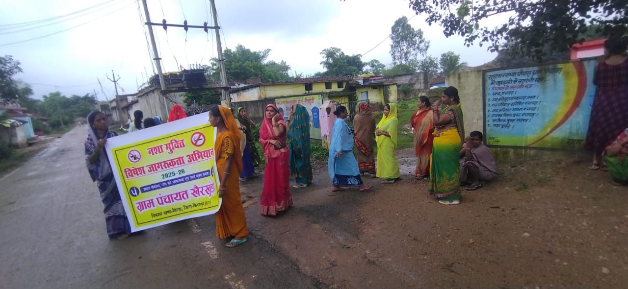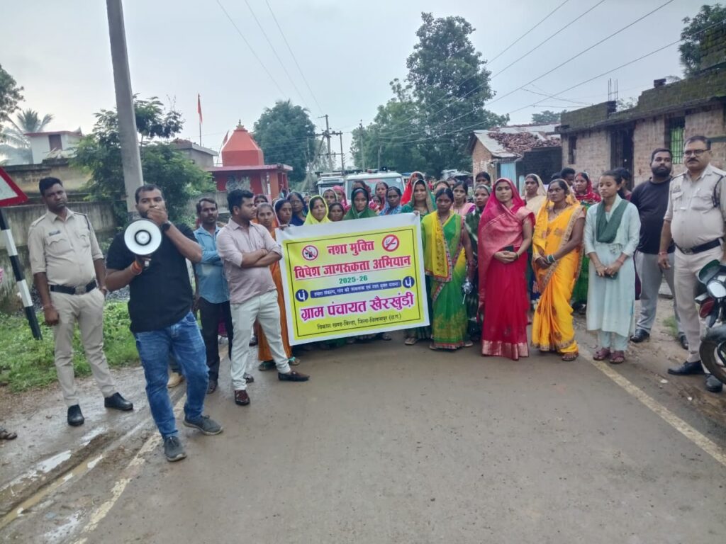 भरारी – आज ग्राम पंचायत ख़ैरख़ुण्डी में सरपंच प्रतिनिधि पार्थमणि भारद्वाज उपसरपंच पिंकी देवी राजपूत पंच सहित जनप्रतिनिधि गण महिला स्व सहायता समूह एवम प्रशासन के तरफ़ से पुलिस कर्मी के साथ ग्राम में *नशा मुक्ति अभियान* चलाया गया जिसमें गांव में शराब गांजा बेचने वाले और हुडदंग मचाने वाले के ऊपर जुर्माना एवम कानूनन कार्यवाही हेतु रैली के माध्यम से प्रावधान किया गया।