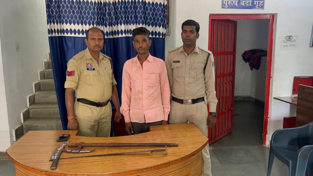 पुलिस की सतर्कता से बड़ी वारदात होने से टली । आरोपी युवक से धारदार तलवार,गंडाशा व तब्बल को किया जप्त ।