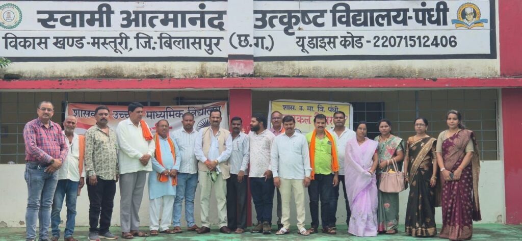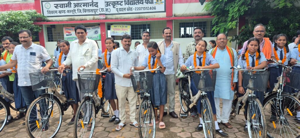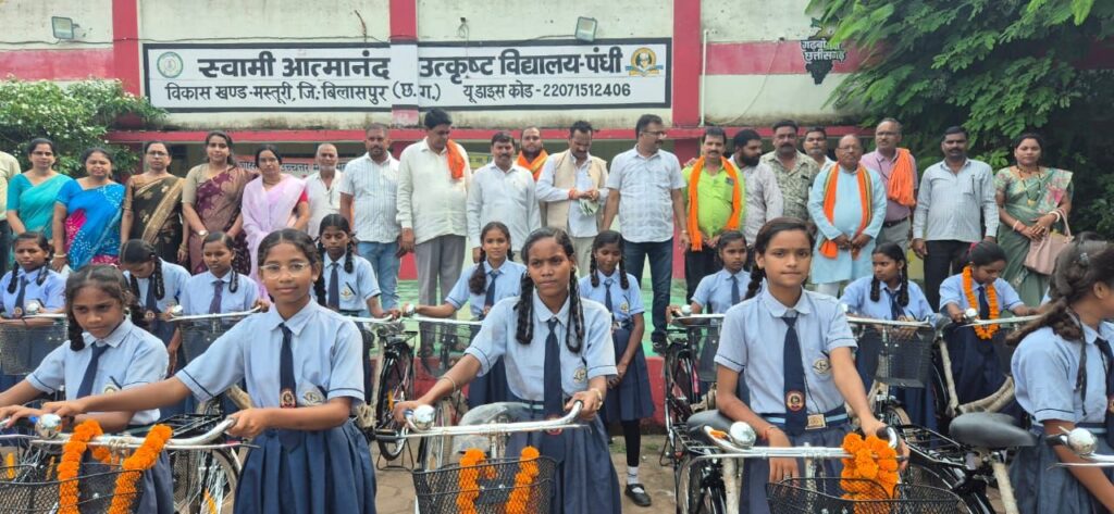 स्वामी आत्मानंद उत्कृष्ट हिंदी माध्यम विद्यालय पंधी में सत्र 2025-26 के अंतर्गत सरस्वती निशुल्क साइकिल योजना के तहत कक्षा 9 वीं की छात्राओं को साइकिल वितरित की गई, इस अवसर पर आयोजित कार्यक्रम में मुख्य अतिथि श्री राजेश सूर्यवंशी जी, अध्यक्ष जिला पंचायत एवं चंद्रप्रकाश सूर्या अध्यक्ष भाजपा अनुसूचित जाति मोर्चा बिलासपुर उपस्थित रहे, कार्यक्रम की अध्यक्षता विद्यालय के प्राचार्य संजय शर्मा ने की