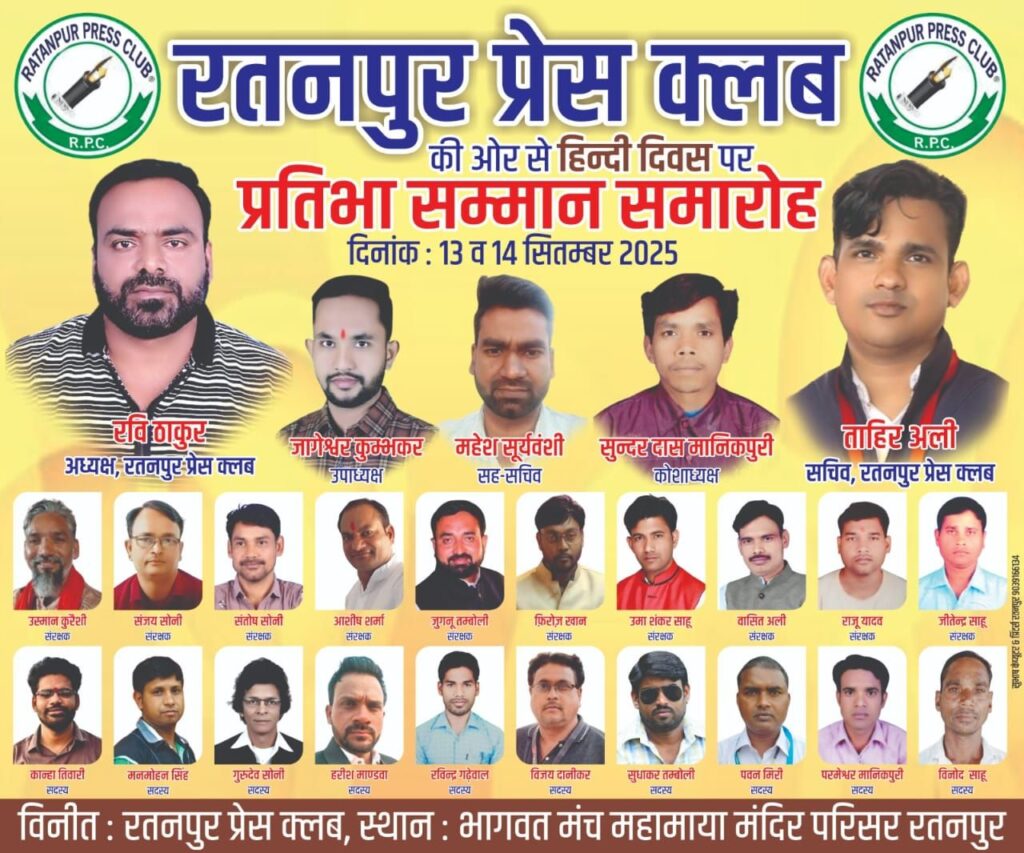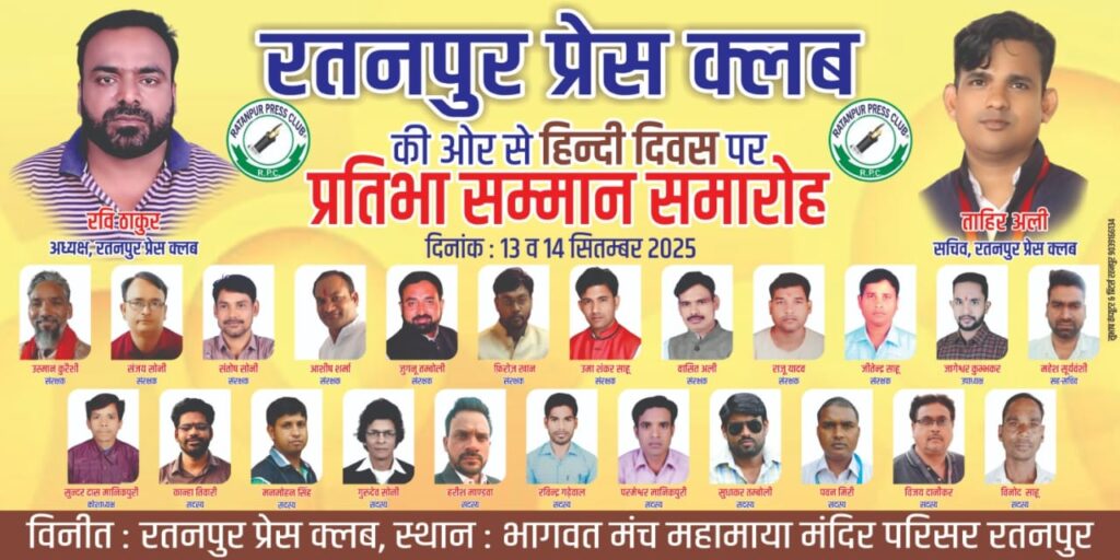 रतनपुर में हिंदी दिवस पर दो दिवसीय 13 व 14 को प्रतिभा सम्मान समारोह कार्यक्रम आयोजित किया जा रहे हैं जिसमें -ग्रामीण प्रतिभाओं को मिलेगा मंच और मान सम्मान ।