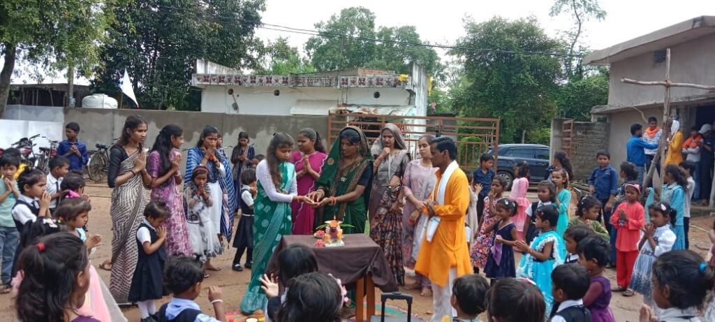 विद्यालय प्रांगण में विद्यार्थियों ने माँ दुर्गा की आराधना करते हुए गरबा नृत्य प्रस्तुत किया। रंग-बिरंगे परिधानों में सजकर बच्चों ने पारंपरिक गीतों की धुन पर गरबा कर वातावरण को धार्मिक और सांस्कृतिक रंग में रंग दिया।