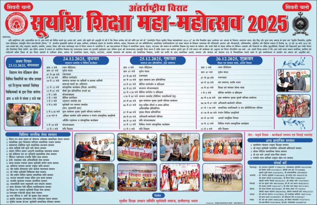 जांजगीर: “सूर्यांश शिक्षा महामहोत्सव का शुभारंभ 23 दिसंबर 2025 को सूर्यांश मेगा मैडिकल कैम्प के साथ होगा। मेगा मैडिकल कैम्प प्रातः नौ बजे से सूर्यांश विद्यापीठ, सूर्यांश प्रांगण, गौरव ग्राम सिवनी में किया गया है जिसमें दिल्ली, रायपुर और अन्य महानगरों के कैंसर सर्जन, स्त्री रोग विशेषज्ञ, बाल रोग विशेषज्ञ एवं अन्य वरिष्ठ एवं अनुभवी विशेषज्ञ डाक्टरों द्वारा कैंसर रोग, स्त्री रोग, बाल रोग, किडनी रोग एवं अन्य गंभीर बीमारियों का चिकित्सकीय परीक्षण, प्राथमिक उपचार एवं उचित सलाह के साथ समुचित दवाओं का वितरण सहित नियमित उपचार हेतु परामर्श देगें। सूर्यांश शिक्षा उत्थान समिति के द्वारा विगत वर्षो की भांति इस वर्ष भी "अंतरराष्ट्रीय विराट सूर्यांश शिक्षा महामहोत्सव" के प्रथम दिवस 23 दिसंबर 2025 को मेगा मैडिकल कैम्प के पश्चात 24 दिसंबर को महामहोत्सव का विधिवत शुभारंभ होगा। इस स्वास्थ्य शिविर में विशेषज्ञ चिकित्सक के तौर पर दिल्ली एम्स एवं अमरूता अस्पताल रायपुर के कैंसर सर्जन विशेषज्ञ डॉ. भारत भूषण खुर्से, डॉ. पुष्पेंद्र पटेल के साथ करूणा श्री केंसर अस्पताल के डॉ. नीलम लदेर एवं डॉ. प्रशान्त कसेर रोगियों का परीक्षण कर उपचार करेंगे। स्त्री रोग विशेषज्ञ के रूप में डॉ. चंद्रकला गढ़ेवाल, डॉ. संध्या गढ़ेवाल, डॉ. पुष्पा खरसन, डॉ. मीनू खुर्से, डॉ. ज्योति प्रभाकर के साथ जीवांश अस्पताल कटघोरा के डॉ. सिलेश्वरी कंवर बनर्जी स्त्री एवं प्रसूति रोगों का परीक्षण एवं उपचार करेंगे। हृदय रोग विशेषज्ञ के तौर पर डॉ.आलोक मंगलम हृदय रोग से संबंधित समस्याओं का उपचार करेंगे। सामान्य बिमारियों के लिए जनरल फिजिशियन डॉ. प्रहलाद गढ़ेवाल, डॉ. संजय खरसन, डॉ.लोकेन्द्र कश्यप, एम्स रायपुर के डॉ. अनिल लटियार, डॉ. अनिल बनर्जी, डॉ. रमेश सूर्यवंशी, डॉ. हेमशिखा ताम्ब्रे चिकित्सा शिविर में उपलब्ध रहेंगे। हड्डी रोग विशेषज्ञ के रूप में डॉ. राजेश वस्त्रकार व डॉ. प्रफुल्ल चौहान अस्थि से संबंधित बिमारियों का उपचार करेंगे। मेडिकल मेगा कैंप में सामान्य रोग विशेषज्ञ के रूप में डॉ. रमेश सरवन, डॉ. एन. के. ध्रुवे, डॉ. दीपक साहू, डॉ. गिरिवर झलरिया, डॉ. विनोद सूर्यवंशी, डॉ. रमेश सूर्यवंशी, डॉ. सुमन गोयल, डॉ. वैशाली चौरसिया, डॉ. अरविंद सूर्यवंशी, डॉ. प्राची करियारे, डॉ. आशीष भास्कर, डॉ. गरिमा, डॉ. भूपेंद्र झलरिया एवं डॉ. देवेन्द्र चौरसिया विभिन्न रोगो का उपचार करेंगे। चिकित्सा शिविर में श्री रामा हास्पिटल चांपा के शिशु रोग विशेषज्ञ डॉ. बृजमोहन जागृति एवं किलकारी अस्पताल जांजगीर के डॉ. हरीश पटेल शिशुओं से संबंधित रोगों का उपचार करेंगे। नाक, कान, गला रोग विशेषज्ञ के तौर में डॉ. सरोज कच्छप, जनरल सर्जरी विशेषज्ञ के रूप में डॉ. कुशल गढ़ेवाल (भोपाल), सिम्स ब