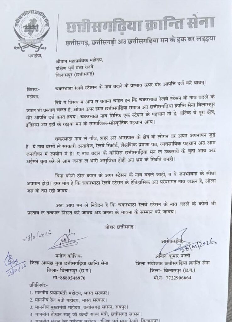 बिलासपुर। चकरभाठा रेलवे स्टेशन का नाम बदलने के प्रस्ताव के विरोध में छत्तीसगढ़िया क्रान्ति सेना बिलासपुर के द्वारा कड़ा विरोध दर्ज कराया गया। संगठन के प्रतिनिधिमंडल ने दक्षिण पूर्व मध्य रेलवे के महाप्रबंधक एवं जिला कलेक्टर बिलासपुर के नाम एक विरोध पत्र सौंपते हुए स्टेशन का नाम यथावत बनाए रखने की मांग की।
