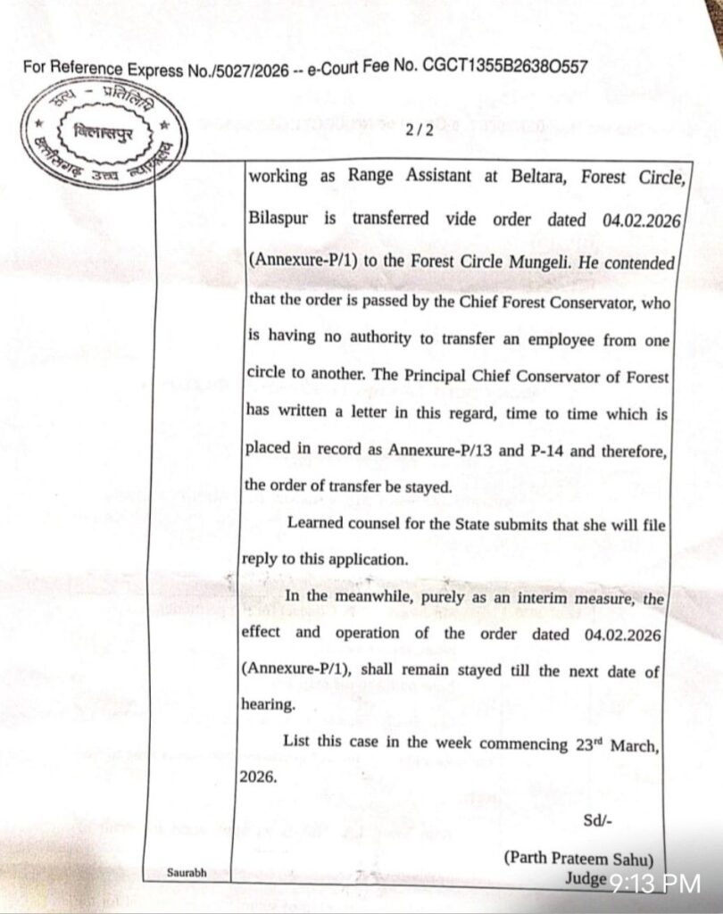 बेलतरा- पार्थ प्रीतम साहू जज की सुनवाई में बेलतरा, फॉरेस्ट सर्कल, बिलासपुर में रेंज असिस्टेंट के तौर पर काम कर रहे एक कर्मचारी का ट्रांसफर 04.02.2026 (Annexure-P/1) के ऑर्डर से फॉरेस्ट सर्कल मुंगेली में किया जाता है। उन्होंने कहा कि यह ऑर्डर चीफ फॉरेस्ट कंजर्वेटर ने पास किया है,